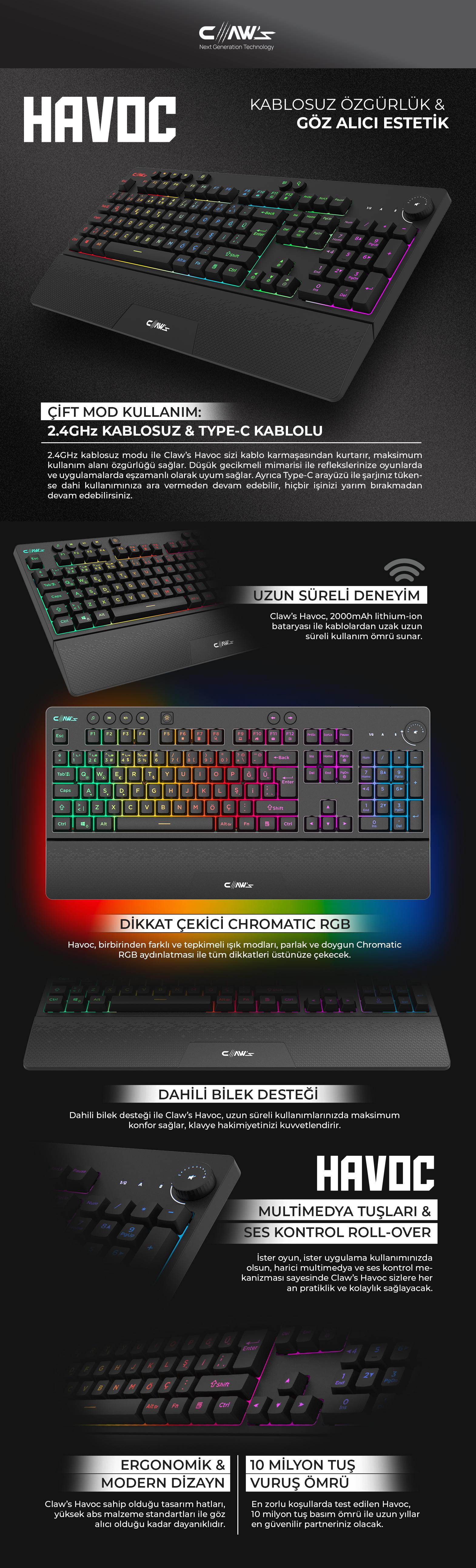 Claw's Havoc Kablosuz - Chromatic Rgb - Bilek Destekli - Multimedya & Ses Kontrol Tuşlu Membran Oyuncu Klavyesi