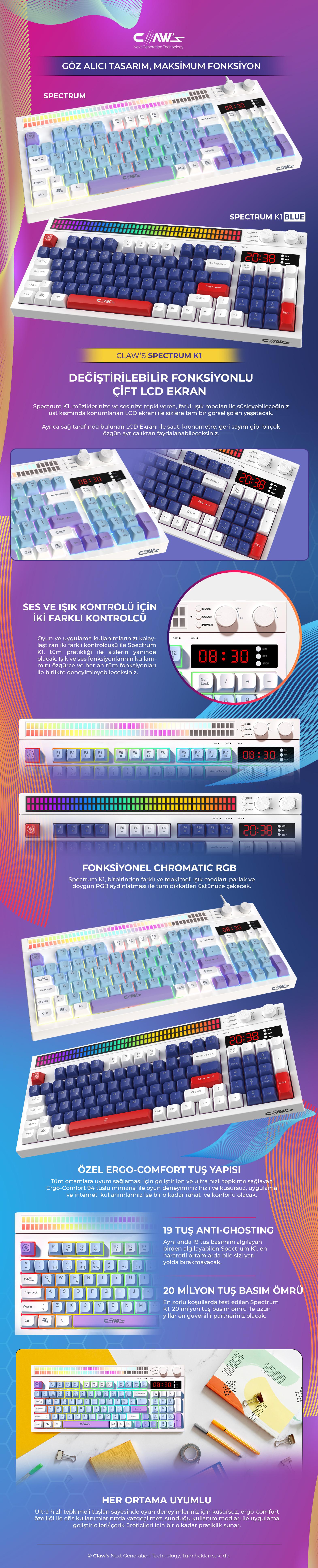 Claw's Spectrum K1 Fonksiyonel Çift LCD Ekran & Çift Rgb - Ses Kontrolcülü Membran 94 Tuşlu Spectrum Rgb Modlu Gaming Klavye Mavi-Kırmızı