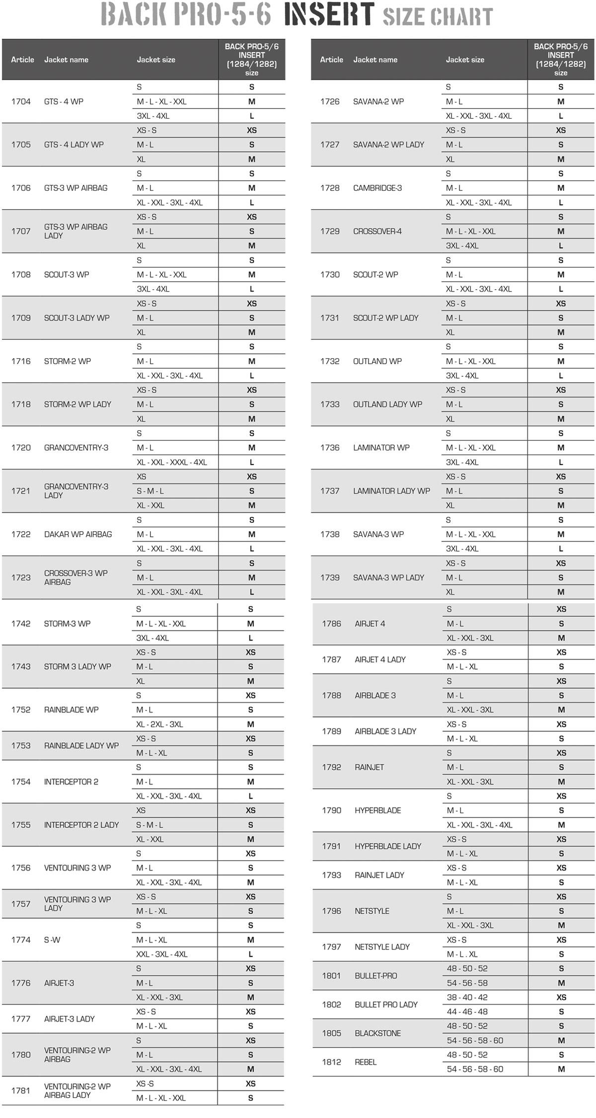 - Montunuza uygun sırt koruması bedenini aşağıdaki listeden seçebilirsiniz