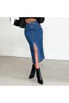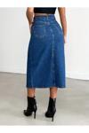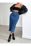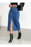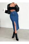 Koyu mavi likralı kot etek, genç ve dinamik tarzınızı yansıtmanız için tasarlanmıştır