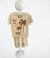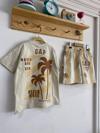 Deniz havasını ve sahil enerjisini yansıtan bu yazlık takım, çocukların sıcak günlerde hem rahat hem de şık görünmesini sağlıyor. Pamuklu tişört ve çizgili şorttan oluşan ikili set, kahverengi palmiye desenleriyle tropikal bir dokunuş katıyor. Günlük kullanımın yanı sıra tatil valizlerinin de vazgeçilmez parçası olacak.Ürün Özellikleri