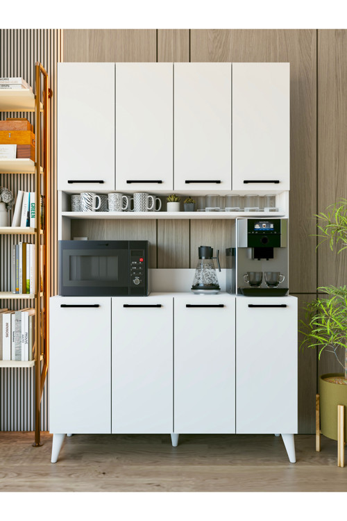 Ürün Açıklaması: 8 kapaklı ve 8 raflı bu çok amaçlı dolap, geniş depolama alanı ve şık tasarımıyla kahve köşeniz ve tüm ev ihtiyaçlarınız için mükemmel bir çözümdür. ; Ölçüler: Derinlik: 40 cm, Yükseklik: 200 cm (ayak dahil), Genişlik: 120 cm, Ayak yükseklik: 15 cm, Üst Dolap Derinliği: 23 cm. ; Malzeme: Ürünün gövdesi 18 mm parlak beyaz suntalamdır. Arkalık beyaz MDF'dir. Ayaklar beyaz, güçlendirilmiş plastiktir. ; Kolay kurulum: Matkap kullanımı gerektirmez, ürünü yalnızca tornavida ve çekiç ile montajlayabilirsiniz. Ürün üzerindeki tüm delikler açılmış olup kurulum sırasında delme işlemi gerektirmez. Kurulum için gerekli hırdavat seti (vida, minifix, çivi vb.) koli içerisinde yer almaktadır. Detaylı olarak hazırlanmış montaj kılavuzu ile kısa sürede kurulum yapabilirsiniz. ; Kalite: Ürünlerimizde 1. Kalite Yonga levha kullanılmaktadır. TSE, Avrupa birliği EN, ISO 9001 ve FSC sertifikalarına sahiptir. E1 standartları dahilinde, kanserojen madde içermez. Tüm üretim proseslerinde detaylı kalite kontrolü yapılmaktadır. ; Paketleme: Ürünün temiz ve hasarsız olarak tarafınıza iletilebilmesi için gerekli tüm önlemler alınmıştır. Üründe kırılmayı önlemek için petek panel, köşebent ve balonlu naylon kullanılmaktadır. Güçlendirilmiş oluklu mukavva ile kırılmalar en aza indirilmektedir. ; Paket İçeriği ve Teslimat: Ürün taşıma kolaylığı ve dayanım sağlaması açısından 3 paket olarak gönderilmektedir. Ürün kargo firmaları tarafından kata teslimat yapılacak şekilde paketlenmiştir. ; Bakım Talimatı: Az miktarda deterjanlı bir bez ile siliniz. Temiz bir bez ile kurulayınız. ; Müşteri Desteği: Her türlü hasar ve eksik parça durumunda iletişime geçerek yedek parça talebinde bulunabilirsiniz. Hasarlı parçaları bize tekrar göndermeniz gerekmez. ; Güvenlik: Devrilebilen mobilyaların duvara sabitlenmesi önerilmektedir. ; Not: Ürün demonte halde gönderilmektedir. Ürüne sadece çok amaçlı dolap dahildir. Görsel amaçlı kullanılan objeler dahil değildir. Ürün renkleri ekrana göre değişiklik gösterebilir. ;