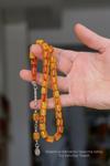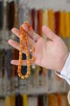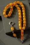 Bu toz kehribar tesbih, yapay kehribar taşından yapılmıştır ve muhteşem renk geçişleriyle damar desenleriyle süslenmiştir.