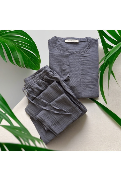 - Gömlek ve pantolon olmak üzere iki parçadan oluşan set halinde gelir evde şıklığı ve rahatlığı bir arada yaşamanız için idealdir.