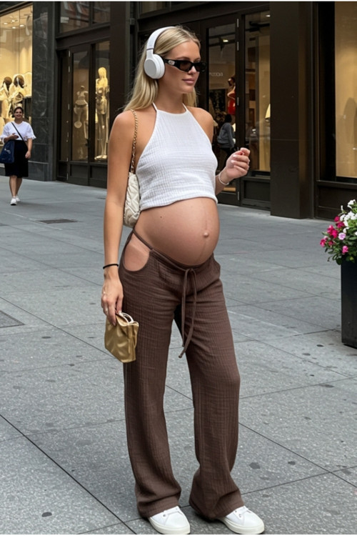 Organik Müslin Hamile Pantolon - ipli olması ve yandan yırtmaçlı olması sebebi ile geniş ve rahat kullanım sağlar.