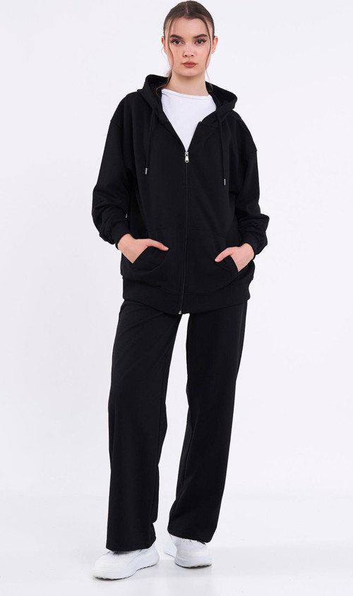 Comeor Kadın Siyah Normal Kalıp Basic Beli Lastikli Kapüşonlu Oversize Mevsimlik Alt Üst Eşofman Takımı CMRE7367