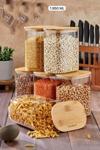 Orta boy hacmi ile bakliyat, kuruyemiş, baharat, şeker gibi malzemeleri güvenle saklamanızı sağlar. Şeffaf cam gövde, içindekileri kolayca görmenize olanak tanır ve mutfak düzeninizi destekler.