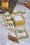 Cooker markasının şık tasarımlı porselen çay fincanı seti, zarif altın yaldız detaylarıyla dikkat çeker.