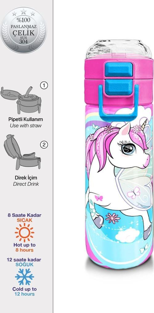Kids Mavi Neon Pembe Unicorn Desenli Pipetli ve Direkt İçim Çelik Termos 500 ml 31925