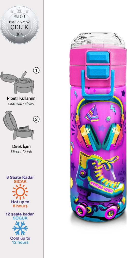 Coral High Kids Pembe Turkuaz Kulaklık Paten Desenli Pipetli ve Direkt İçim Çelik Termos 500 ml 31955