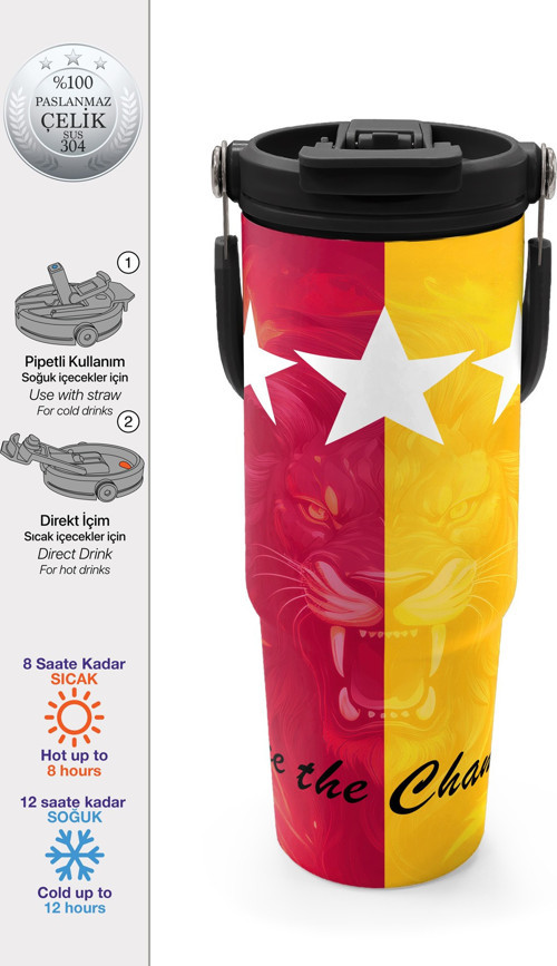 Coral High Kids Sarı Kırmızı 5 Yıldız Aslan Taraftar Desenli Pipetli ve Direkt İçim Çelik Termos 900 ml 38731