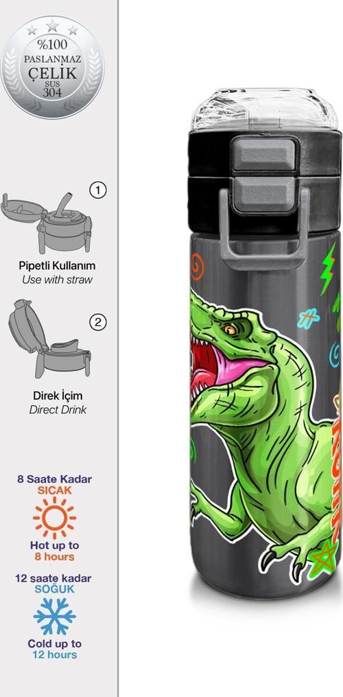 Kids Siyah Gri Dinozor Desenli Pipetli ve Direkt İçim Çelik Termos 500 ml 31946