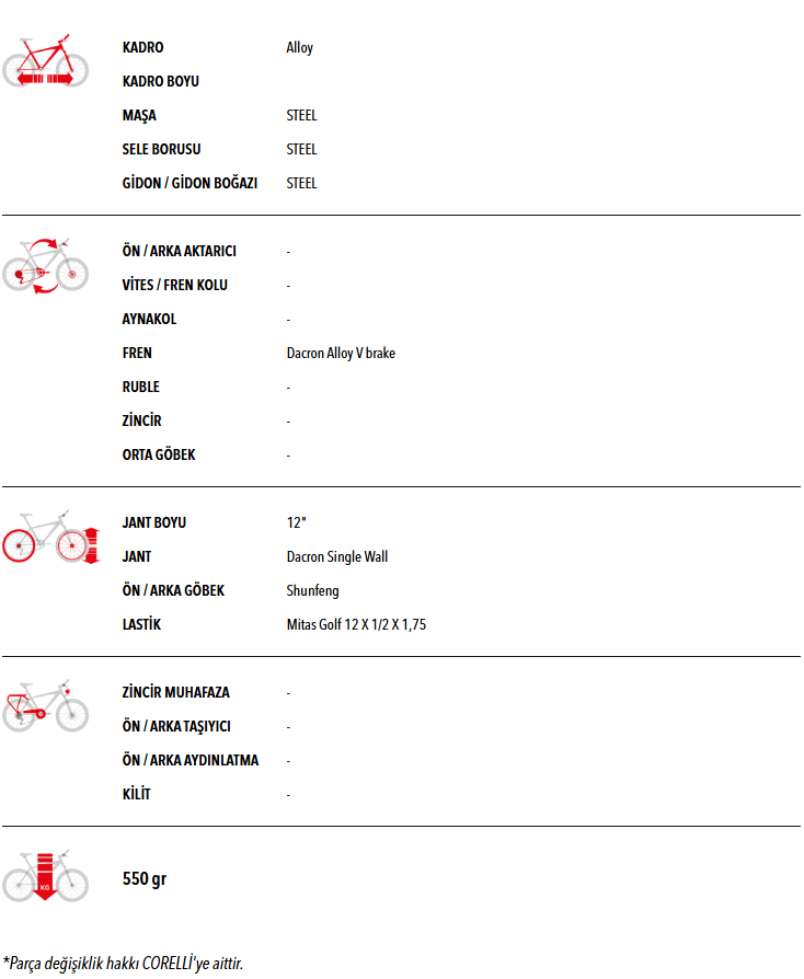 KADRO Alloy KADRO BOYU MAŞA STEEL SELE BORUSU STEEL GİDON / GİDON BOĞAZI STEEL Gear ÖN / ARKA AKTARICI - VİTES / FREN KOLU - AYNAKOL - FREN Dacron Alloy V brake RUBLE - ZİNCİR - ORTA GÖBEK - Rim JANT BOYU 12" JANT Dacron Single Wall ÖN / ARKA GÖBEK Shunfeng LASTİK Mitas Golf 12 X 1/2 X 1,75 Plus ZİNCİR MUHAFAZA - ÖN / ARKA TAŞIYICI - ÖN / ARKA AYDINLATMA - KİLİT - Kg 550 gr