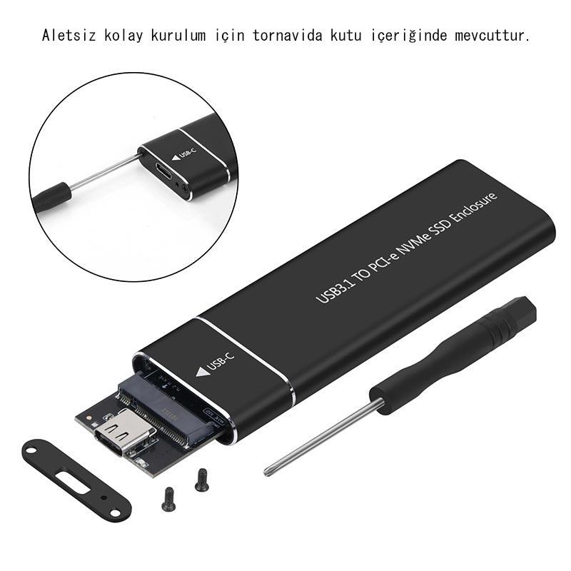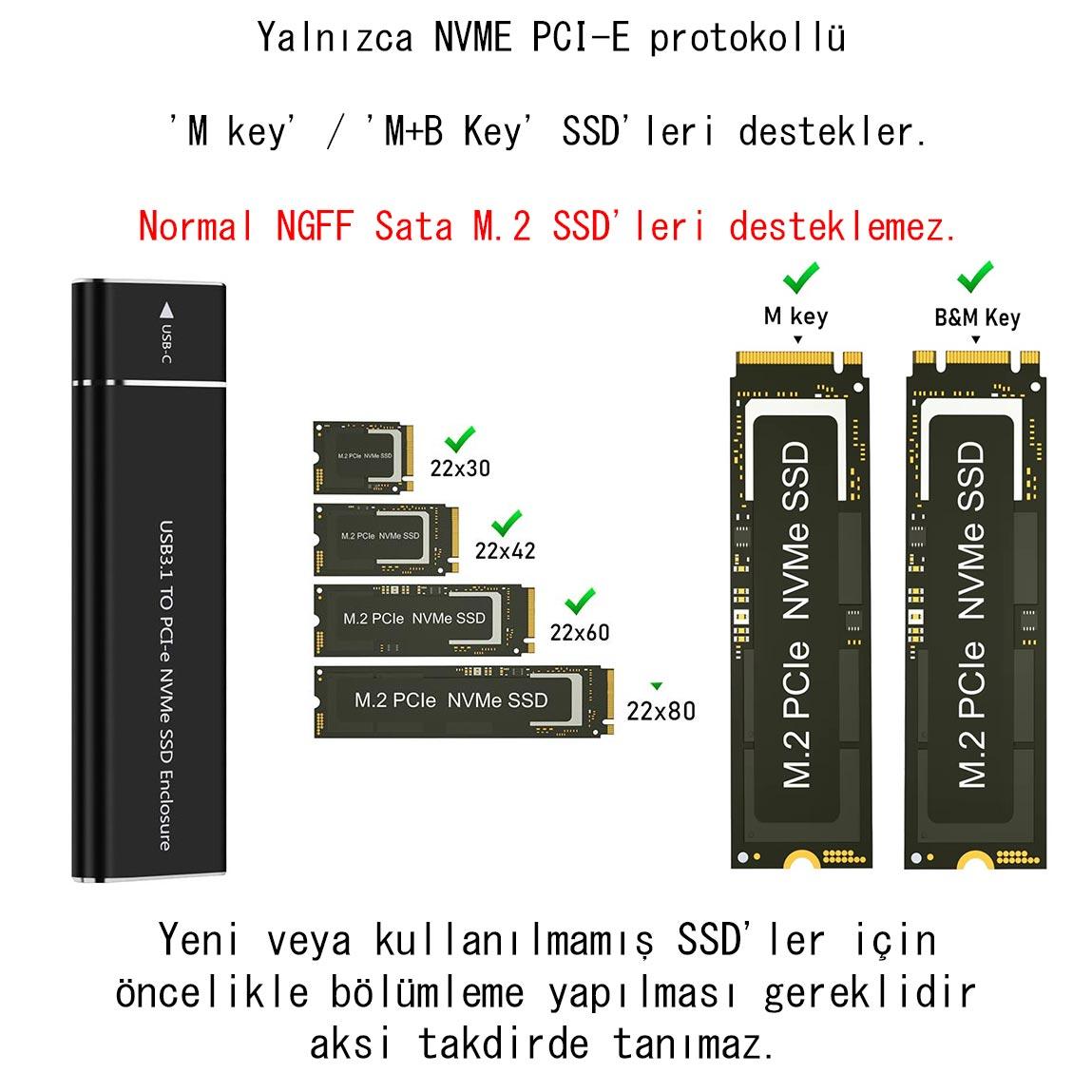 - 【M.2 NVMe PCIe Kutusu】Yalnızca NVME PCI-E protokollü 'M key' / 'M+B Key' SSD'leri destekler. Normal NGFF Sata M.2 SSD'leri desteklemez.