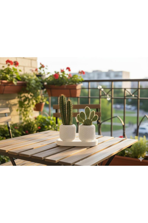 * 3 Parçalı Set: 2 adet geometrik dokulu saksı ve 1 adet şık, oval sunum tepsisinden oluşur.