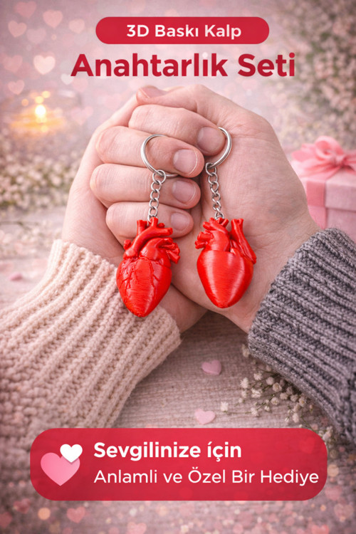 - Sevgiliye özel tasarlanmış, 3D baskı teknolojisiyle üretilmiş kalp anahtarlık seti.