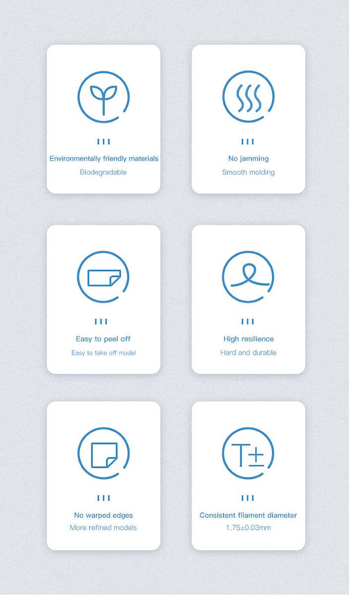 1,75 mm çapında, PLA filament, 1 Kg (2,2 lbs) net ağırlık.