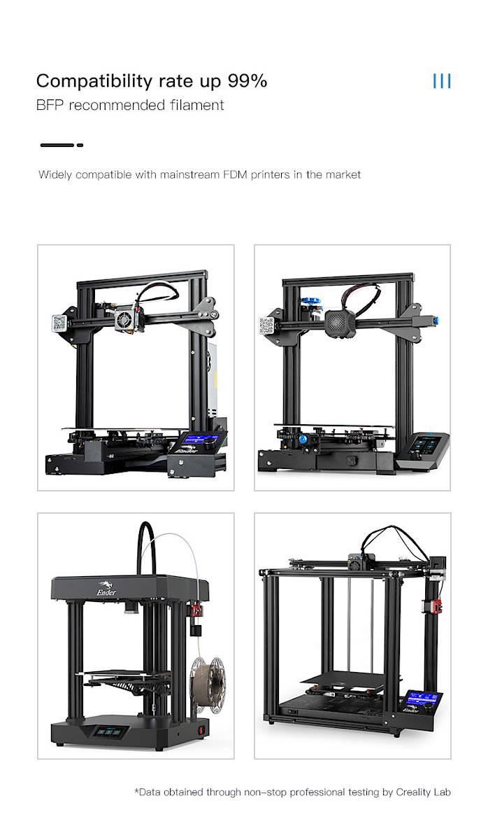 1,75 mm çapında filament kullanan tüm 3D yazıcılarla uyumludur.