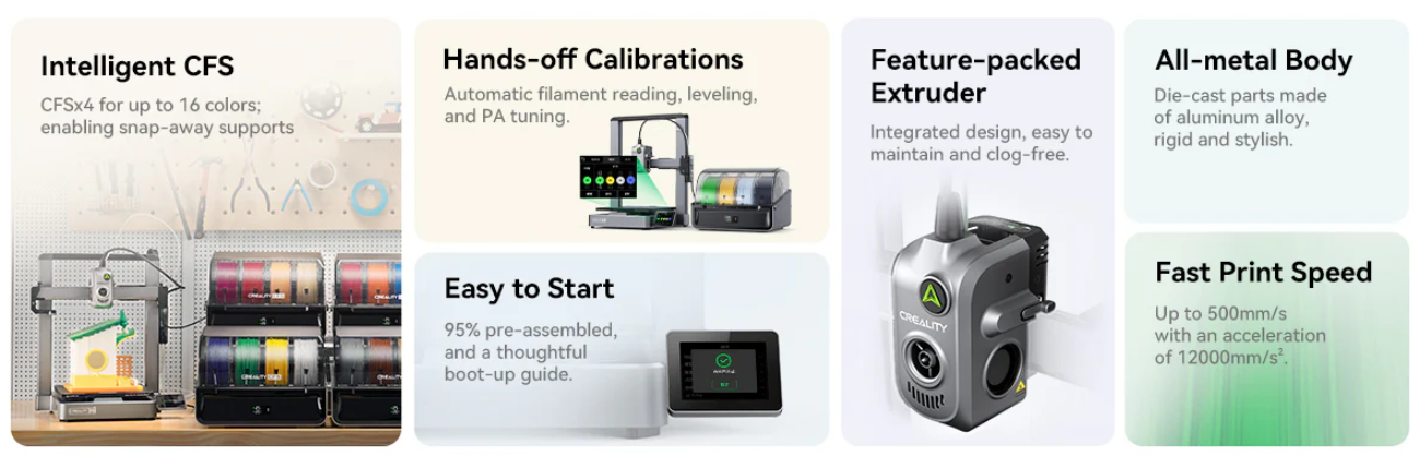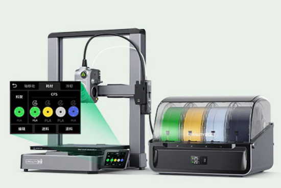 Creality CFS ise 4 rulo desteğiyle çok renkli ve çok malzemeli baskıları otomatik olarak yönetir. RFID teknolojisi ile filamentleri otomatik tanır, akıllı kurutma özelliği ile malzemelerinizi ideal koşullarda muhafaza eder. Birden fazla CFS sistemi kullanılarak 16 renge kadar baskı yapılabilir.