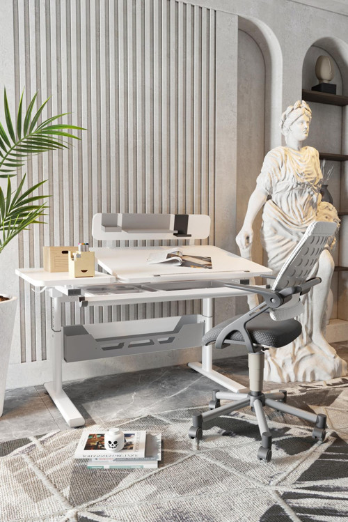 Çekmeceli ve Raflı TasarımKalem, silgi ve boya kalemleri gibi malzemeler için özel tasarlanmış çekmecesi ve kitap, dosya gibi eşyalar için geniş rafları ile düzenli bir çalışma ortamı sunar.