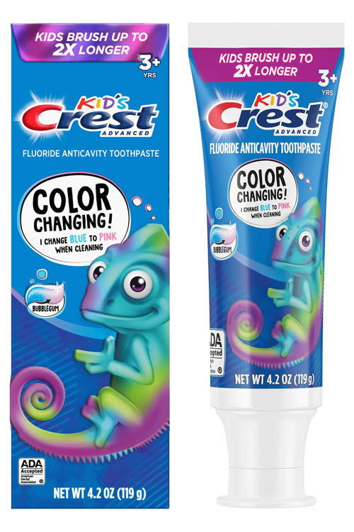 Crest Kids Advanced Renk Değiştiren Sakız Aromalı Çocuk Diş Macunu, çocukların diş fırçalama süresini uzatmaya yardımcı olan eğlenceli bir formüle sahiptir. Fırçalama sırasında rengi mavi renkten pembe renge dönüşür, böylece çocukların önerilen 2 dakika boyunca fırçalama yapmasını teşvik eder.