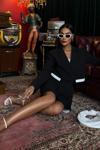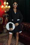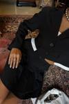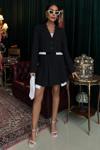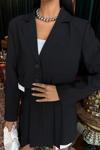 Siyah renkteki crop ceketiyle modern ve şık bir görünüm sunar.