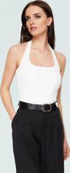 Rahatlığı ve şıklığı bir arada sunan bu bluz, yüksek kaliteli örme kumaştan üretilmiştir. Vücut hatlarınızı zarif bir şekilde saran fitted kalıbı, her vücut tipine uyum sağlayacak şekilde tasarlanmıştır. Boyundan bağlamalı halter yakası ise hem şık hem de pratik bir kullanım sunuyor. Cepsiz tasarımıyla minimalist bir görünüm sağlarken, sırt dekoltesi ise bluza feminen bir hava katıyor.