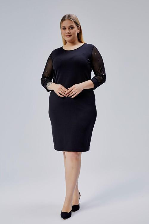Zarif inci detayları ile süslenmiş, büyük beden midi boy elbise, şıklığı ve rahatlığı bir arada sunar.