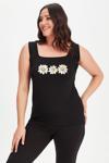 Büyük Beden Papatya Baskılı Kare Yaka Kalın Askılı Atlet Bluz