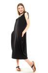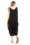 Standart boy kesimiyle her yaş grubuna hitap eden siyah ip askılı jumbo salaş elbise, günlük kullanıma uygun rahatlık sunar..