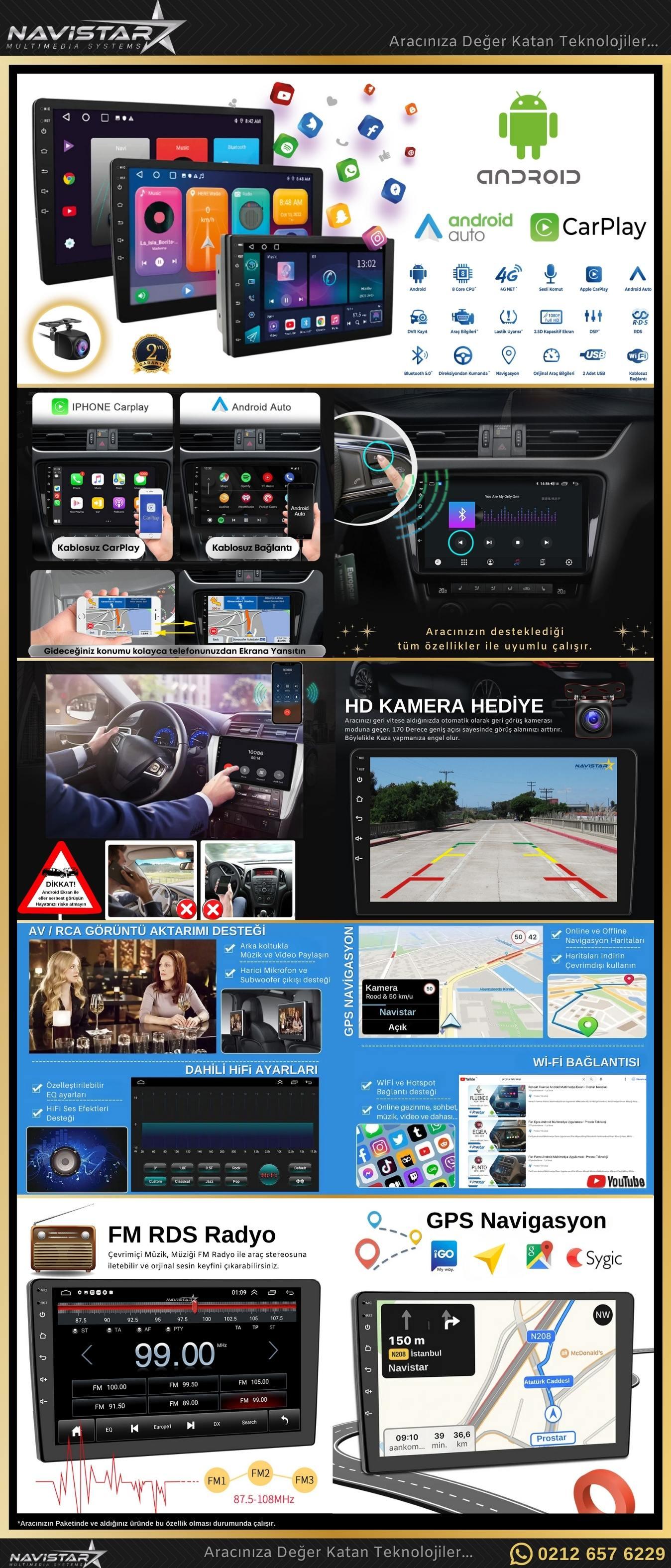 Kablosuz Apple Carplay ve Kablosuz Android Auto özelliklerine sahiptir. 4 çekirdek işlemciye sahip olan üstün özelliklerdeki ürün, 2 GB Bellek bulunurken 32 GB Dahili Hafızası bulunmaktadır. IPS ekranı sayesinde net görüntü elde edersiniz. Wifi, Bluetooh, navigasyon, gibi tüm Android özelliklerini kullanabilirsiniz. Beraberinde gelen Canbus ile aracınızın beyninin desteklediği tüm özellikleri Multimedya ekranınız ile uyumlu bir şekilde kullanabilirsiniz. Navistar Multimedya ekranın sağladığı DSP Özelliği ile üstün ses çıkışları sayesinde hoparlörünüzde her zamankinden çok daha net bir ses almanızı sağlayacaktır.