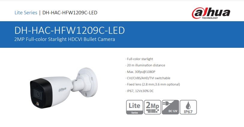 Dahua DH-HAC-HFW1209CP-LED 2mp 3.6mm Lens Full-color starlight 4in1 AHD Kamera