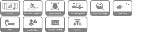 Yüz algılama; yüz tanıma; video meta verileri (insan, motorlu taşıtlar ve motorsuz taşıtlar); çevre koruması; SMD Plus; stereo analiz; kalabalık dağılımı; insan sayımı; ANPR; araç yoğunluğu; ısı haritası | ||||||||||||||||||||||||||||||||||||||||||||||||||||||||||