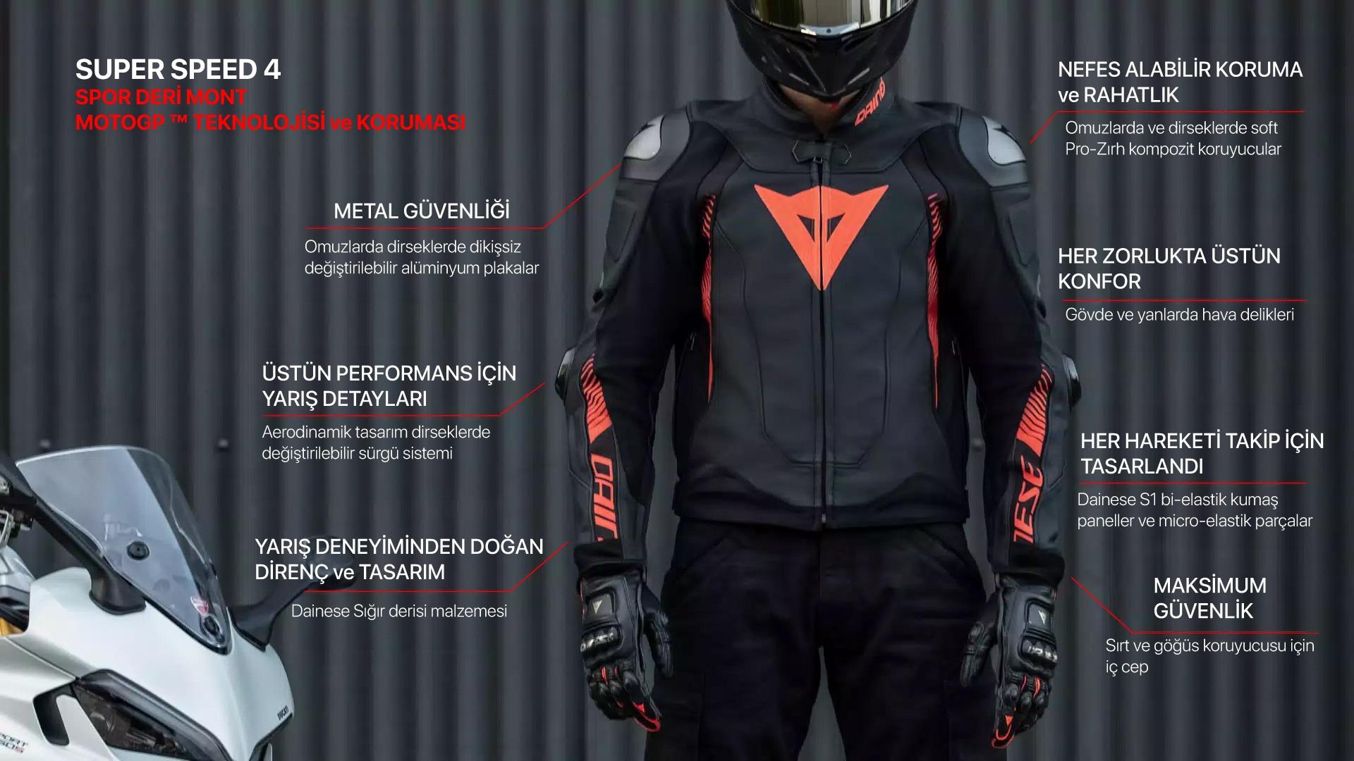 Super Speed 4, Microelastic 2.0 ve vücuda uyum sağlayan ve tüm hareketlerinde onu takip eden 2 yönlü streç kumaş S1 ek parçalarına sahip delikli Tutu dana derisinden yapılmış sportif bir motosiklet ceketidir. Super Speed 4 ceket, dirseklerdeki kompozit malzemeden sertifikalı koruyucular, plastikten RSS dirsek kaydırıcıları (Değiştirilebilir Güvenlik Sistemi), omuzlardaki sertifikalı Pro-Armor koruyucular ve göğüste çift koruyucu için bir cep sayesinde yüksek düzeyde güvenlik ve konforu bir araya getirir. Asfaltla temas halinde kaymayı kolaylaştırmak ve tehlikeli devrilmeleri önlemek için omuzlara metal plakalar entegre edilmiştir. Super Speed 4, karın ve gövdedeki elastik yapı sayesinde rahattır ve optimum bir uyum sunar.