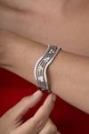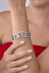 Üzerindeki taş işlemeler, ışığı her açıdan yansıtarak bileziğe sofistike bir ışıltı kazandırır. Günlük kombinlerinizi tamamlayan bu özel tasarım, aynı zamanda özel günlerde zarif bir aksesuar olarak da kullanılabilir.