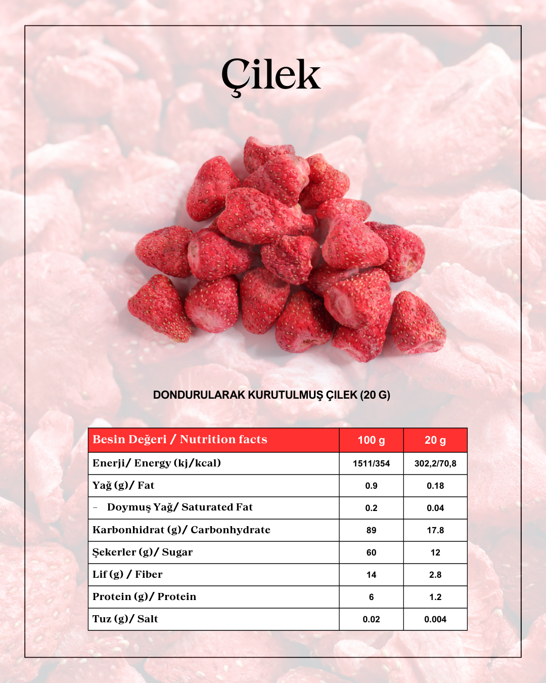 Dondurularak Kurutulmuş Meyve dilimlerimiz tamamen katkısız ve doğal olmakla birlikte sadece meyveden üretilmiştir.