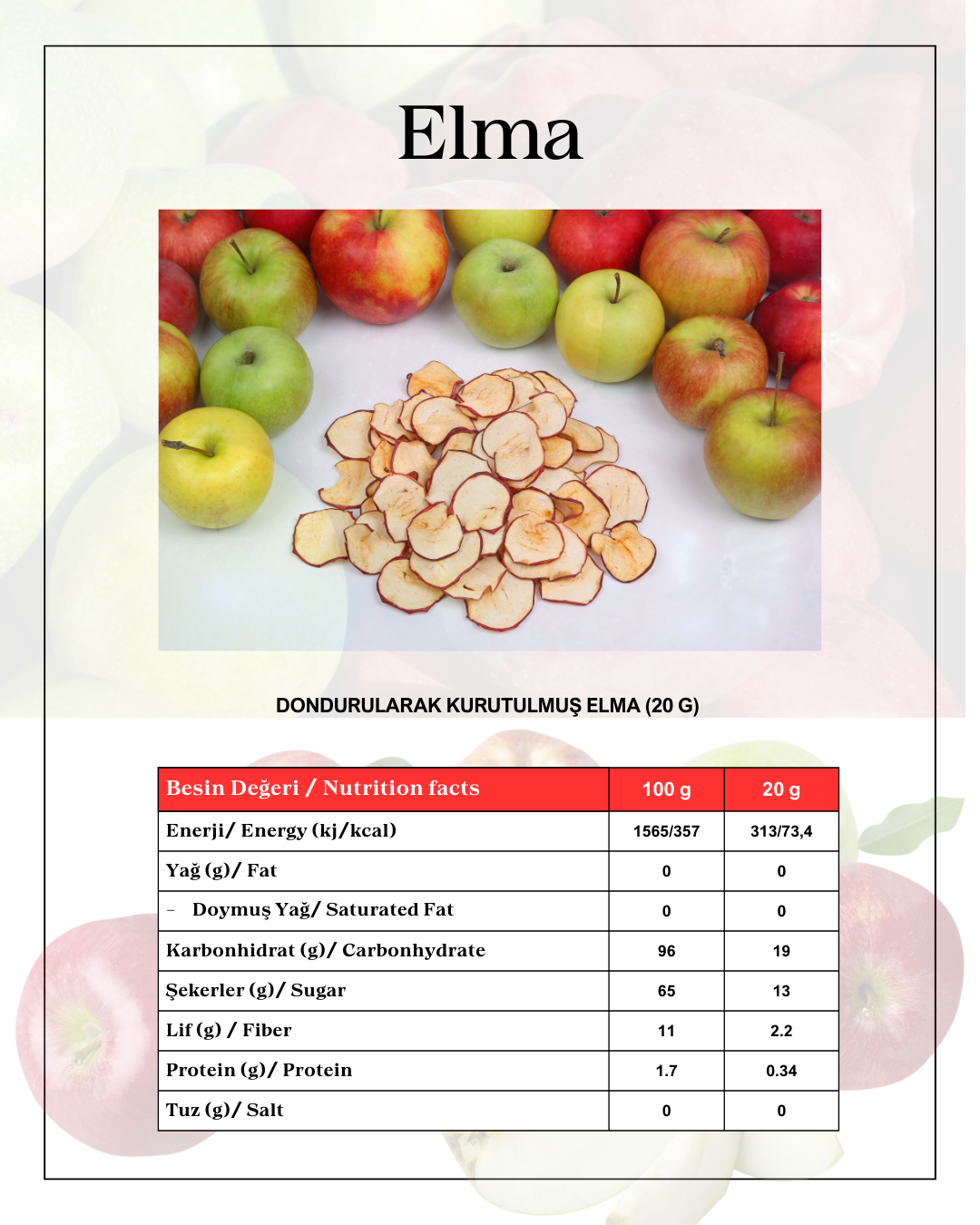 Dondurularak Kurutulmuş Meyve dilimlerimiz tamamen katkısız ve doğal olmakla birlikte sadece meyveden üretilmiştir.