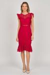 Detay: Kollar ve etek ucu volanlı, astarlı abiye elbise;