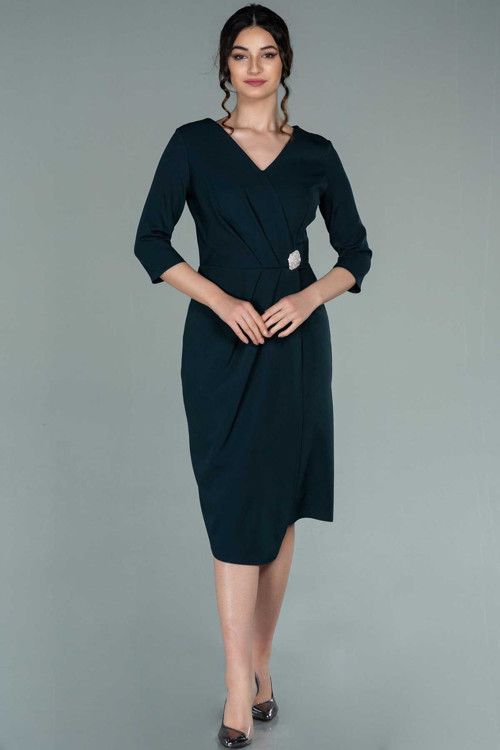 Detay: V yaka, krep, göğüs pedli midi abiye elbise;