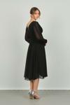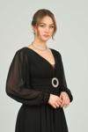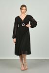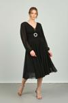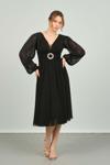 Detay: Taş toka detaylı, ön-arka derin V yaka, midi boy, astarlı abiye elbise;