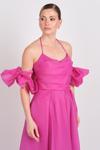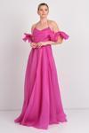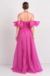 Detay: Romantik ve zarif detaylarıyla öne çıkan bu maxi abiye elbise, boyundan bağlamalı tasarımıyla şıklığı vurgularken seyyar kol detayı sayesinde farklı kullanım alternatifleri sunar. Hafif dokulu şifon kumaşıyla uçuşan bir siluet yaratırken, kloş kesimi feminen ve hareketli bir görünüm kazandırır. Astarlı yapısı konforlu bir kullanım sağlarken, özel davetlerde hem sade hem etkileyici bir stil arayanlar için ideal bir tercihtir;