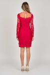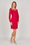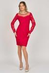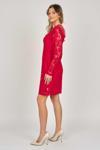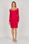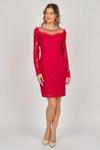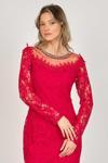 Detay: Yakası taşlı, kısa, astarlı abiye elbise;