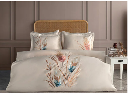 Yatak odanıza sıcak ve huzurlu bir hava katın! Doğanın ilham verdiği zarif ot ve tüy desenleriyle tasarlanmış bu bej renkli nevresim takımı, saten dokusuyla hem şıklığı hem de konforu bir arada sunuyor. Yumuşak dokusuyla cildinize dost, estetik görünümüyle göz alıcı bir tasarıma sahiptir.