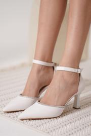 Etiler Collection'un zarif tasarımıyla dikkat çeken bu beyaz topuklu ayakkabı, şıklığı ve konforu bir arada sunar.