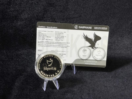 2020–2021 Süper Lig sezonunda Beşiktaş’ın elde ettiği 16. şampiyonluğu onurlandırmak amacıyla hazırlanan bu gümüş hatıra sikke, kulüp tarihinin en anlamlı başarılarından birini kalıcı bir koleksiyon eserine dönüştürmektedir. Beşiktaş’ın köklü mirası, şampiyonluk teması ve zarif işçilik bu sikkede bir araya gelmiştir.