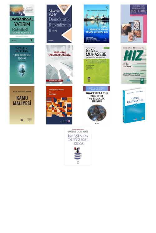 Davranışsal Yatırım Rehberi - Demokratik Kapitalizmin Krizi - Deniz Taşımacılığının Temel Unsurları - Ekonominin Lokomotifi Kobi'lerin Olmazsa Olmazları - Ethereum'un İnşası: Hisse İspatı - Finansal Tablolar Analizi - Genel Muhasebe - Hız - Kamu Maliyesi - Modern Para Teorisi ve Politikası - Shakespeare'in Yönetim ve Liderlik Sırları - Temel İşletmecilik - İŞBAŞINDA DUYGUSAL ZEKA