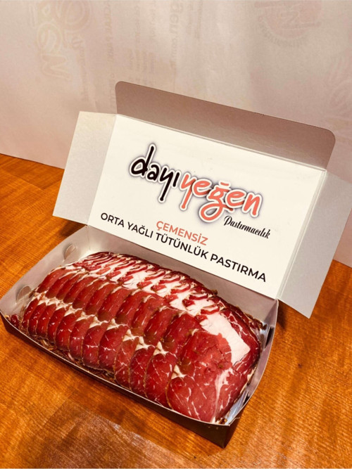 Çemensiz Özel Üretim Tütünlük Orta Yağlı Pastırma Çemeni temizlenmiş, pastırma gurmelerine orta yağlı, etin en özel bölgesinden ağızda eriyen özel üretim pastırma.