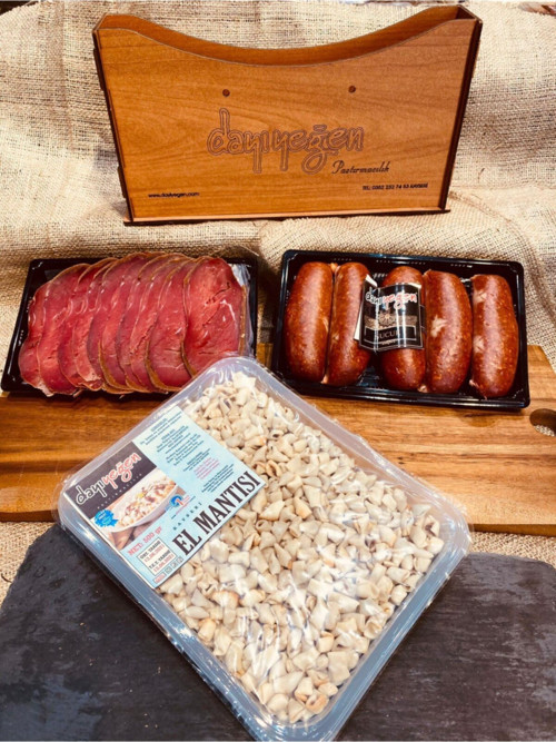 Paket içeriği Özel evlik sucuk 500 gr Lokum pastırma 250 gr El sıkımı mantı 500 gr