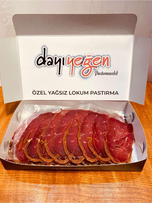 Özel Yağsız Lokum Pastırma Damak tadına önem verenlere hem yağsız, hem sinirsiz sırt etinden lokum kıvamında özel evlik pastırma.