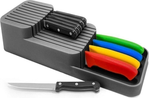 GRİ RENK GÖNDERİLECEKTiR. 2-Sıra bıçaklık 2 katlı yapısı sayesinde yer kazandırır. 2 parçadan oluşur. Altında bulunan bölmeyi açarak temizlenebilir. Toplamda 18 adet bıçak kapasitesi bulunmaktadır. Çekmecede veya tezgah üstünde kullanılabilir. Koku yapmaz. Malzeme: Proplopilen plastik. Genişlik: 14.4 cm. Uzunluk: 39 cm. Yükseklik: 7.1 cm